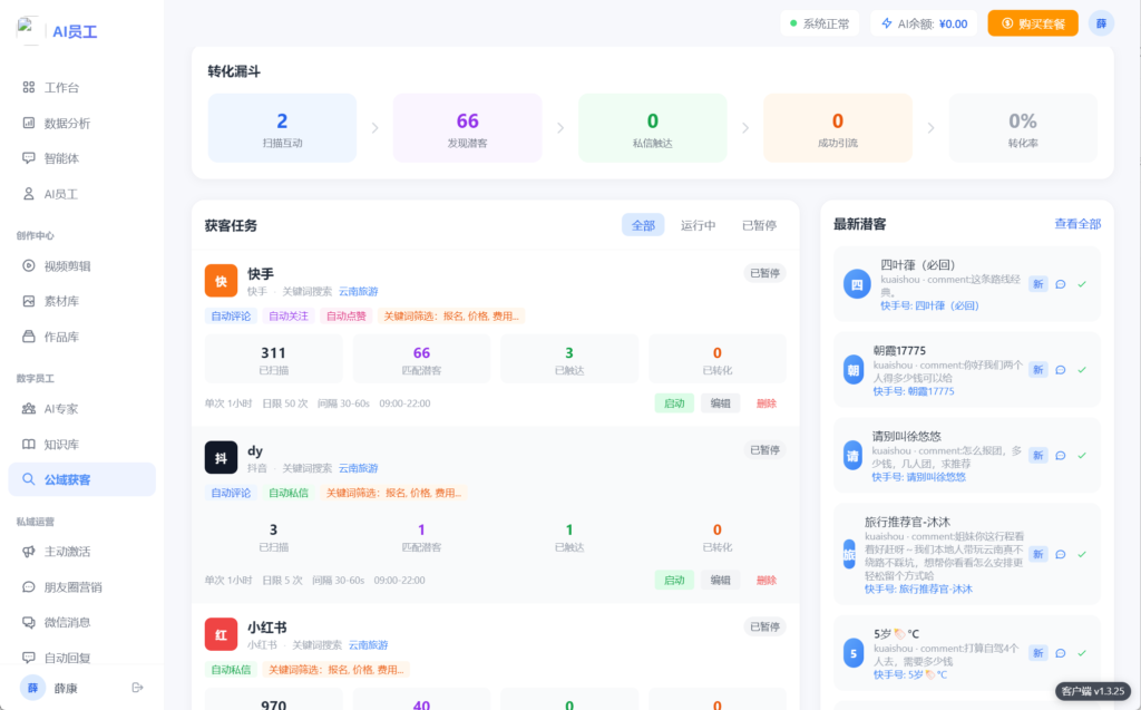 评论区关键词扫描、自动评论/关注/私信、线索自动回传、多平台批量执行