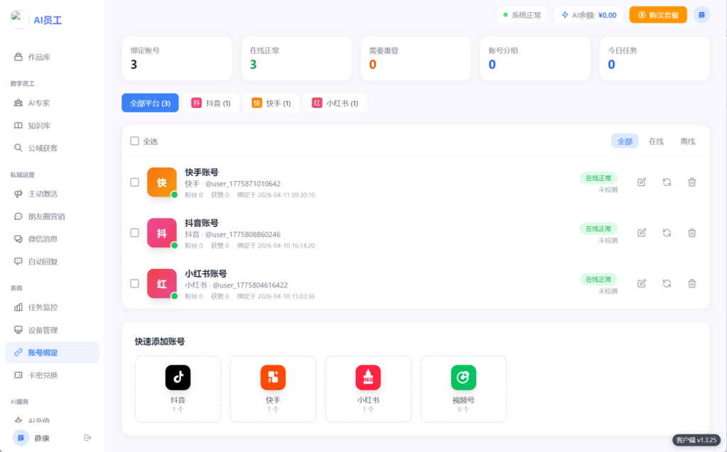 抖音、快手、小红书、视频号、B站——自动登录、视频发布、点赞、评论、关注、浏览
